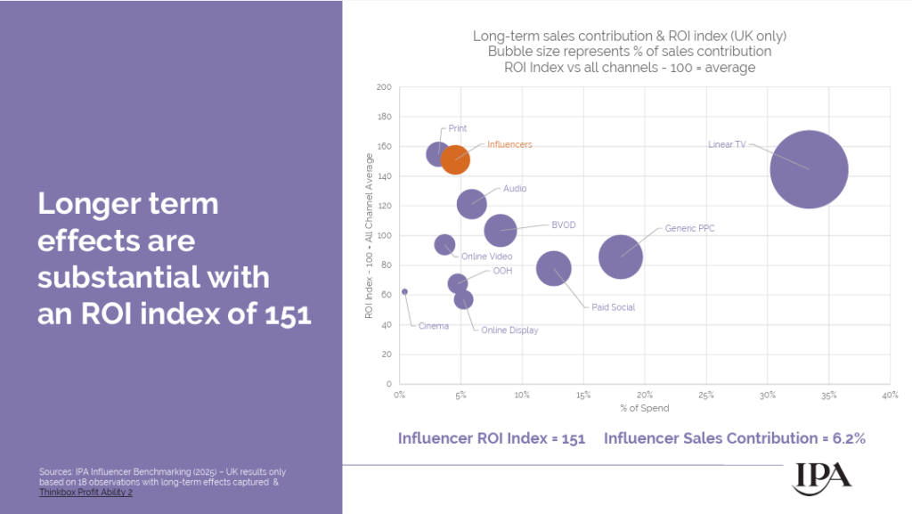 In the long term, according to the IPA study, influencer marketing dramatically outperforms standard paid social, currently sitting at the top of the long-term performance hierarchy. The reason? While short-term sales lift may be modest, the sustained impact on brand equity, loyalty, and audience connection compounds over time in ways that standard social advertising simply cannot match.