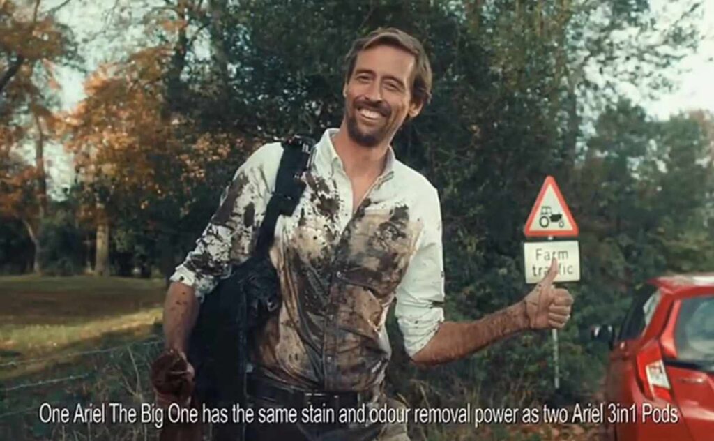 5. In ‘The Big One’, Ariel cleverly plays with the name of their product throughout the ad with rangy Peter Crouch experiencing various ‘big’ stain experiences with the subsequent riposte of ‘big deal’. The Ebiquity pollsters clearly like their cleaning detergent ads to feature a footballer with Persil & Saka ranking well last year too, showing that using a celebrity can be a good way to differentiate yourself versus the competition.