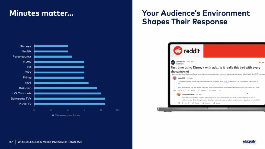 The SVODs like Netflix are committed to four minutes of ads per hour to maintain that premium environment and prevent churn. Broadcasters are mirroring linear, which consumers are accustomed to. But FAST channels? That’s where you find significantly more clutter. And yes, this does impact audience response.