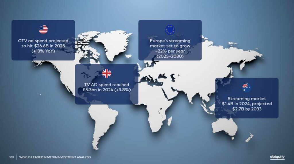 In the US, connected TV ad spend is projected to hit $26.6 billion this year, up 13% year-on-year. Here in the UK, total TV ad spend reached £5.3 billion in 2024, a 4% increase driven by streaming channels. Europe’s streaming market is set to grow approximately 22% per year through 2030. Australia’s streaming market, worth $1.4 billion in 2024, is projected to hit $2.7 billion by 2033.